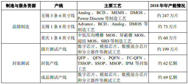 其中,8英寸晶圓生產(chǎn)線年產(chǎn)能約為73萬片,6英寸晶圓生產(chǎn)線年產(chǎn)能約為247萬片;在重慶擁有1條8英寸半導(dǎo)體晶圓制造生產(chǎn)線,年產(chǎn)能約為60萬片;在無錫和深圳擁有半導(dǎo)體封裝測(cè)試生產(chǎn)線,年封裝能力約為62億顆。