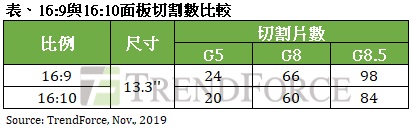 對面板廠來說,16:10 因上下高度增加,導(dǎo)致切割數(shù)減少,玻璃利用率下降,進(jìn)一步影響銷售利潤。以 13.3 寸為例,16:9 于五代線切割片數(shù)為 24 片,切割率 88%,但 16:10 于五代線切割片數(shù)為 20 片,切割率下降到 77%。雖然目前有多家品牌廠正與面板廠協(xié)商 16:10 面板,但大多數(shù)為尋求技術(shù)與意見交流,實際量產(chǎn)案子并不多。