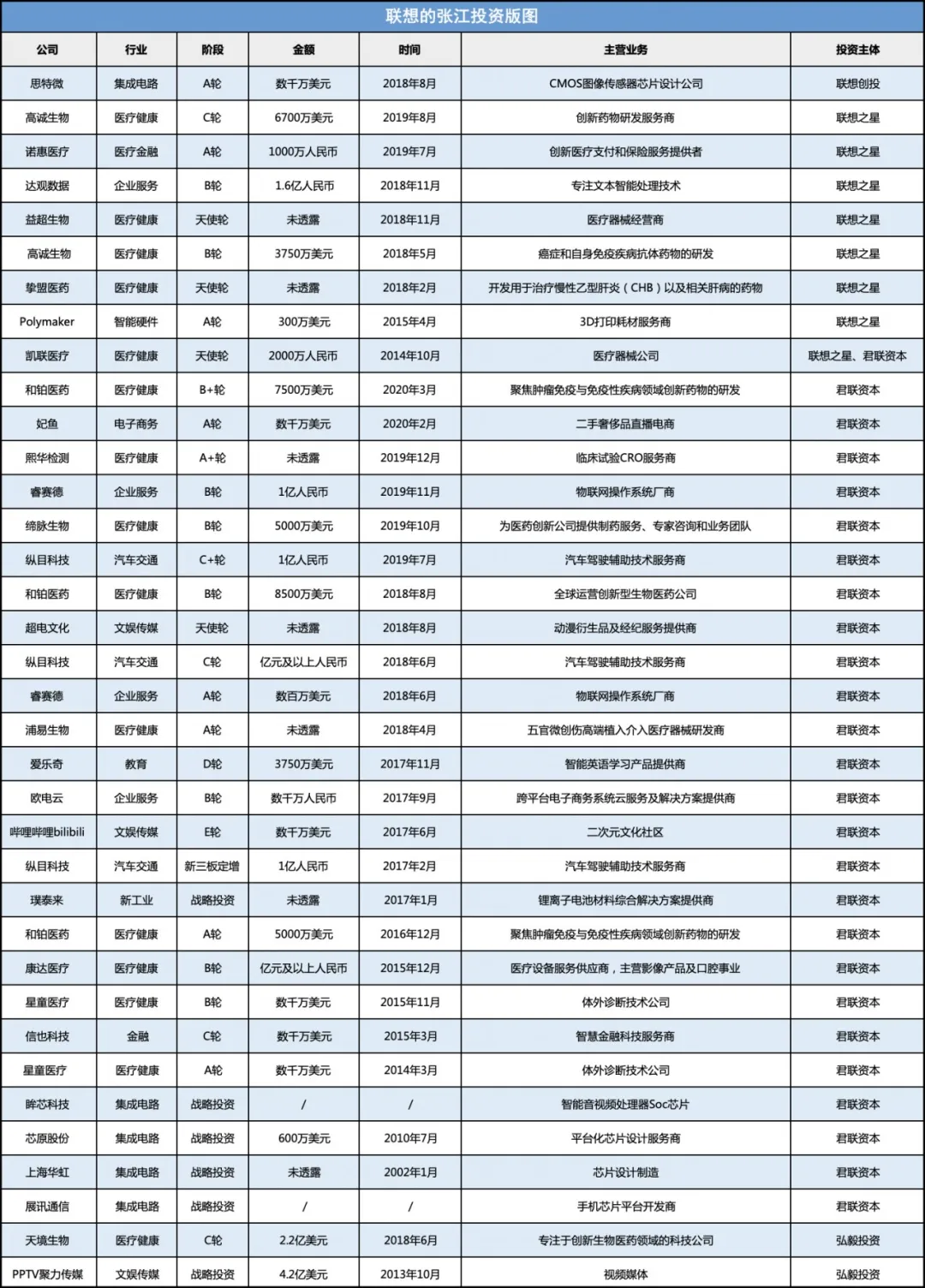 聯(lián)想之星、聯(lián)想創(chuàng)投對張江企業(yè)的投資年份,則主要集中在18、19年,重點投資了醫(yī)療健康和集成電路公司,也是當時行業(yè)的熱門賽道。而進入2020年,疫情的爆發(fā)讓醫(yī)療健康產(chǎn)業(yè)的投資價值愈加凸顯。就在今年3月份,君聯(lián)資本繼續(xù)加碼和鉑醫(yī)藥,參與投資了和鉑醫(yī)藥7500萬美元B+輪融資,擴展自身在醫(yī)療健康領(lǐng)域的投資版圖。