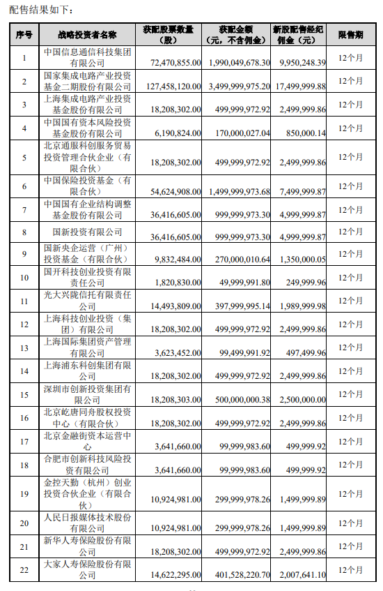 其中,國(guó)家大基金二期獲配股票數(shù)量1.27億股,繳納金額(包含經(jīng)紀(jì)傭金)35.18億元;新加坡政府投資有限公司(GIC Private Limited)獲配股票數(shù)量1.09億股,繳納金額(包含經(jīng)紀(jì)傭金)33.17億元;青島聚源芯獲配股票數(shù)量8058.99萬(wàn)股,繳納金額(包含經(jīng)紀(jì)傭金)22.24億元。
