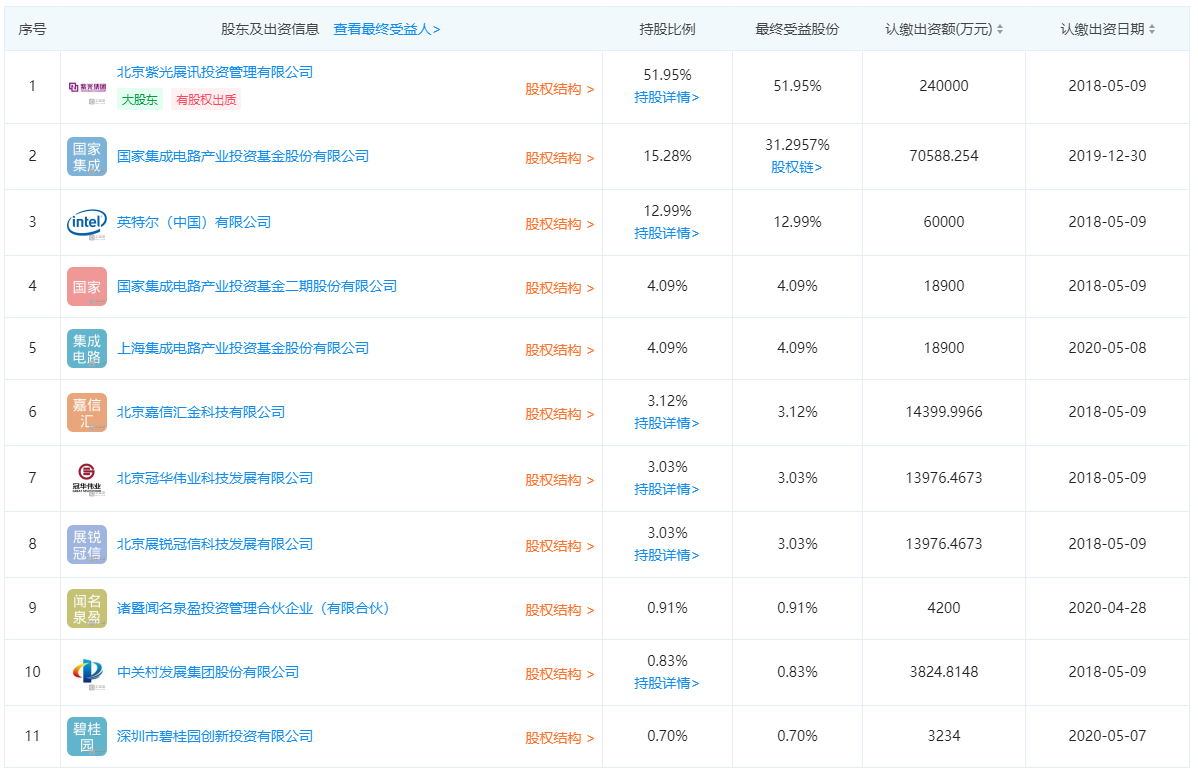 工商信息變更后,紫光展銳股東及持股比例如下: