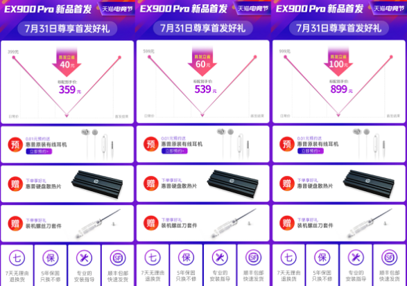 半導體聯(lián)盟報道,7月31日至8月2日天貓電競節(jié)促銷活動,HP EX900 Pro M.2固態(tài)硬盤256GB版本直降40元,首發(fā)到手價只需359元;512GB版本活動直降60元,首發(fā)到手價只需539元;1TB版本直降100元,首發(fā)到手價僅899元。此外下單即送送惠普原裝散熱片,順豐包郵....當前,新品首發(fā)0.01元預約下單送惠普原裝耳機。