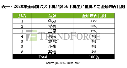 針對目前全球前六大品牌的5G產(chǎn)量排名預(yù)測,華為因受到美國出口禁令影響,轉(zhuǎn)以中國內(nèi)需銷售市場為主,且為迎合中國積極推動5G商轉(zhuǎn)計劃,預(yù)估今年5G手機(jī)產(chǎn)量約7,400萬支,穩(wěn)居全球第一。