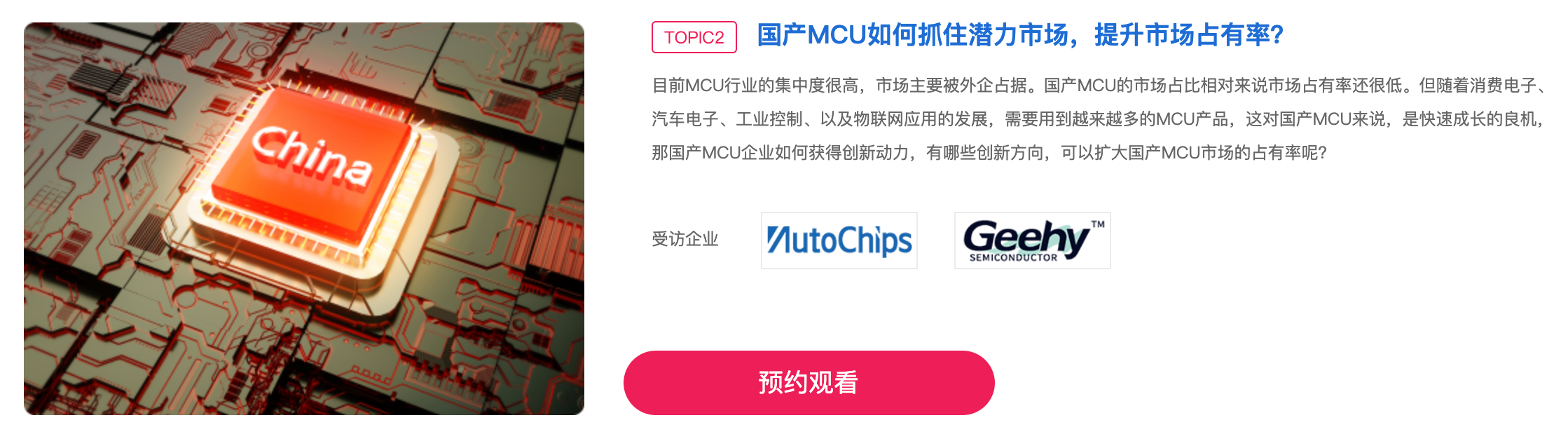 本次展會將在館內(nèi)建立直播間,圍繞“國產(chǎn)存儲供應(yīng)鏈崛起”和“國產(chǎn)MCU如何抓住潛力市場,提升市場占有率?”為主要話題,邀請行業(yè)領(lǐng)軍人物接受視頻采訪,為大家分享產(chǎn)業(yè)新動向、產(chǎn)品新技術(shù)、創(chuàng)新解決方案等。