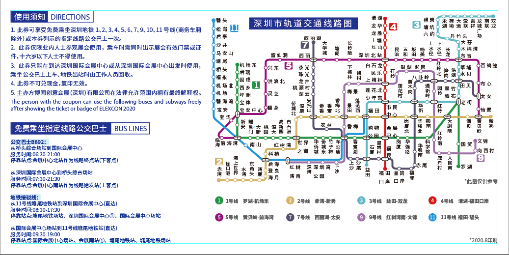 展會期間,專業(yè)觀眾手持ELEXCON電子展"免費公交地鐵乘車券",即可免費乘坐票面指定公交巴士及地鐵路線。(乘車券憑參觀證到咨詢臺及觀眾預(yù)登記處領(lǐng)取,詳情請閱讀乘車券須知)