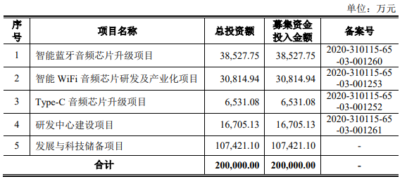根據(jù)招股說明書顯示,恒玄科技此次在科創(chuàng)板上市擬募集資金20億元,扣除發(fā)行費(fèi)用后,將投資于智能藍(lán)牙音頻芯片升級項(xiàng)目、智能WiFi音頻芯片研發(fā)及產(chǎn)業(yè)化項(xiàng)目、Type-C音頻芯片升級項(xiàng)目、研發(fā)中心建設(shè)項(xiàng)目、以及發(fā)展與科技儲(chǔ)備項(xiàng)目。