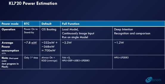 與上一代的KL520芯片相比,KL720 NPU的頻率從300Mhz提高到700Mhz,其在8-bit模式峰值速率也從上一代的345 GOPS, 576MAC/cycle提升到這一代的1.5TOPS,1024 MAC/cycle;用于控制的M4內(nèi)核的頻率也從上一代的200Mhz提升到這一代的400Mhz;關于這個新芯片,還有一點值得強調(diào)一下,那就是他們的AI協(xié)處理器從上一代的ARM Cortex-M4改換為這一代的DSP,因為DSP的特性,這無疑將進一步增加他們新款SoC的實力。