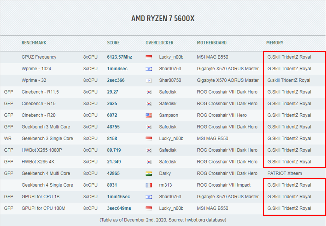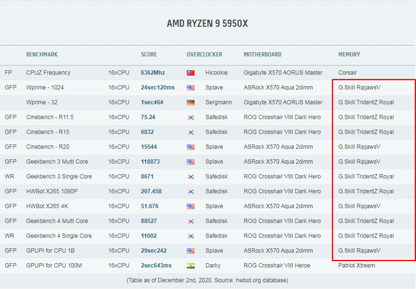 2020年12月4日 – 世界知名超頻內(nèi)存及高端電競(jìng)外設(shè)領(lǐng)導(dǎo)品牌,芝奇國(guó)際榮幸宣布于全球知名超頻評(píng)分排名機(jī)構(gòu)HWBOT網(wǎng)站上,在新一代Ryzen 5000系列處理器的多項(xiàng)超頻紀(jì)錄中為使用率最高的內(nèi)存品牌,再次展現(xiàn)芝奇高端內(nèi)存無(wú)可比擬的絕佳超頻性能。