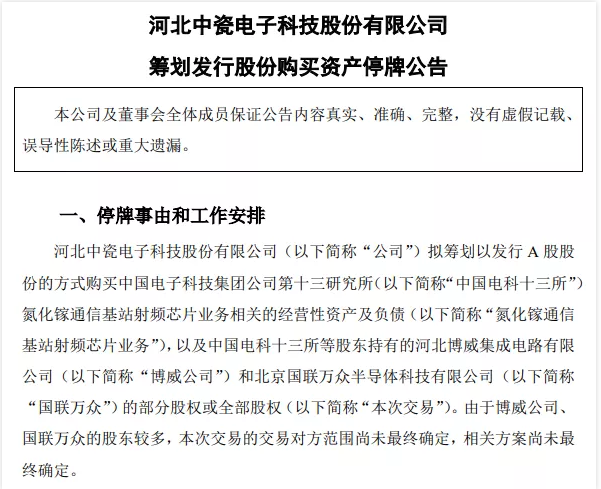 根據(jù)公告,中瓷電子擬籌劃發(fā)行A股股份購買中國電科十三所氮化鎵通信基站射頻芯片業(yè)務(wù)相關(guān)的經(jīng)營性資產(chǎn)及負(fù)債,以及中國電科十三所等股東持有的河北博威集成電路有限公司(以下簡稱“博威公司”)和北京國聯(lián)萬眾半導(dǎo)體科技有限公司(以下簡稱“國聯(lián)萬眾”)的部分股權(quán)或全部股權(quán)。
