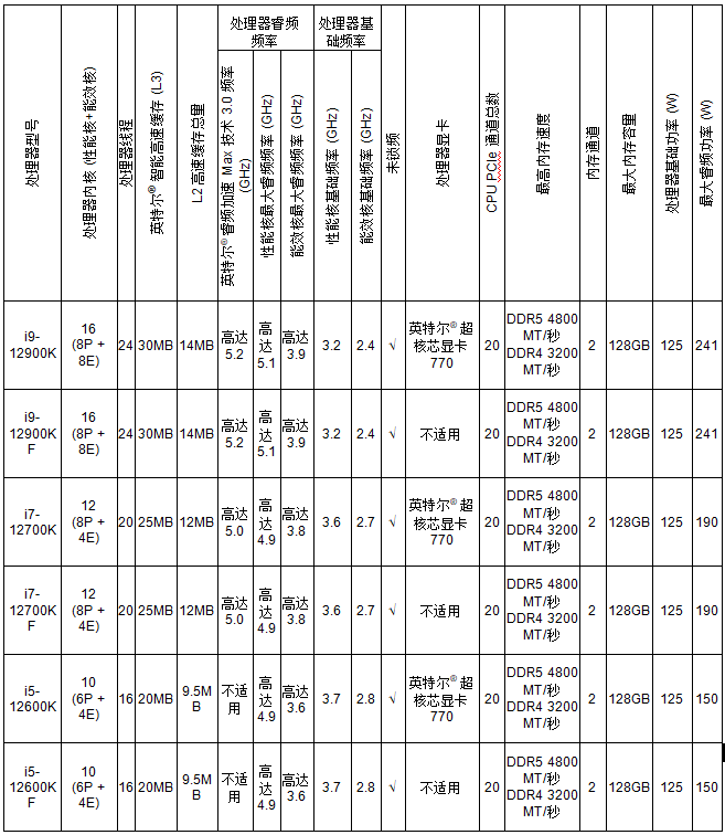 該芯片最高配備16個核心和24個線程,即同時擁有8顆性能核(P-Core)+8顆能效核(E-Core),默認(rèn)睿頻頻率分別可達(dá)5.2GHz、3.9GHz。與11代相比,照片編輯性能提升高達(dá) 36%,視頻編輯性能提升高達(dá)32%,3D建模性能提升高達(dá)37%,多幀渲染速度提升高達(dá)100%。