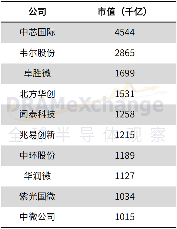 最近一個月,中環(huán)股份、華潤微和紫光國微三家企業(yè)市值紛紛突破千億,目前,已經(jīng)有10家企業(yè)市值處于千億以上。