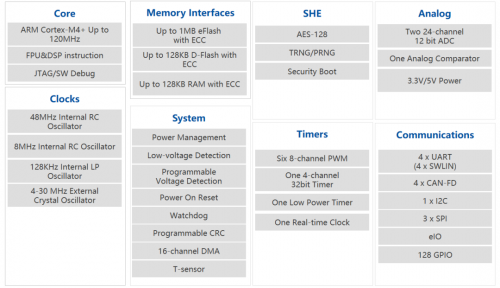 AC7840x為ARM Cortex™-M4F 120 MHz CPU,支持FPU,支持DSP指令,存儲(chǔ)器最大1MB Code Flash,dual bank,支持ECC、最大128KB Data Flash,最大128KB RAM。