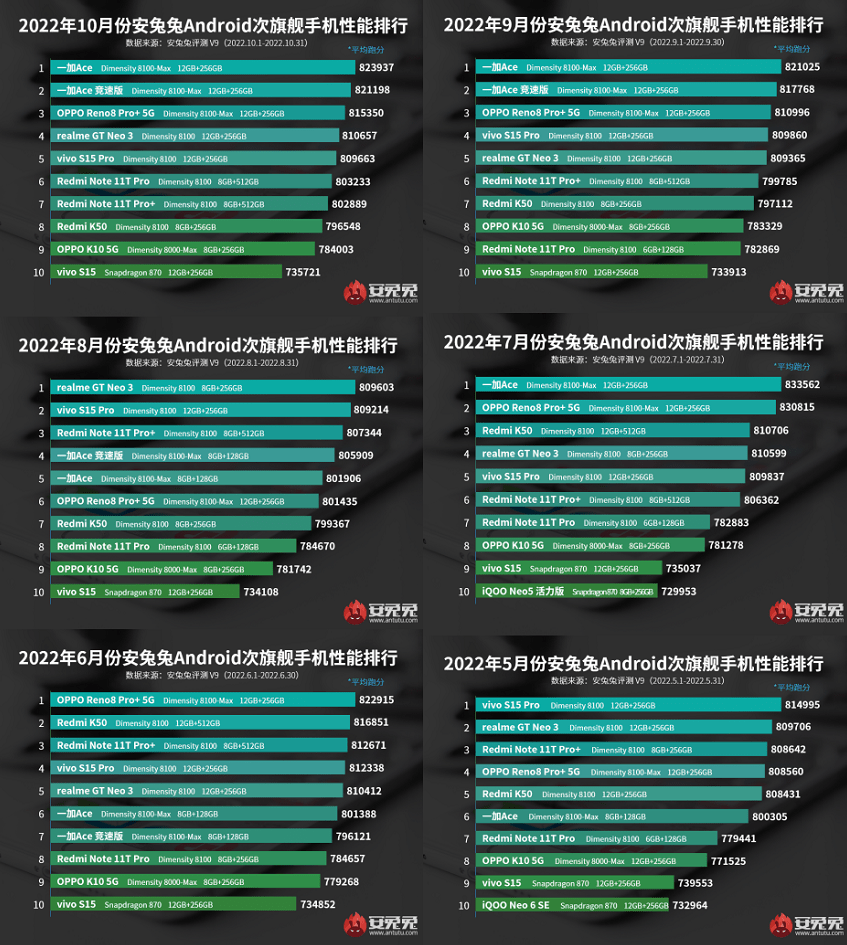 今年以來,天璣8100和天璣8000在性能方面打出了傲人戰(zhàn)績。不久前安兔兔官方發(fā)布了10月安卓次旗艦手機(jī)性能排行榜,前9名均被搭載天璣8000系列的手機(jī)包攬。采用天璣8000系列的終端繼4月份登頂次旗艦手機(jī)性能排行榜之后,已經(jīng)打出連續(xù)6個(gè)月“屠榜”的輝煌戰(zhàn)績,可以說神U一代打遍天下無敵手。