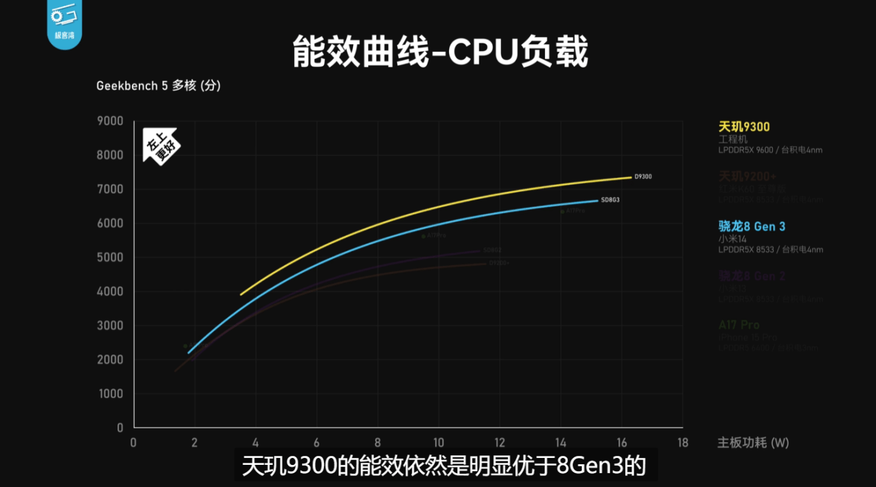 當(dāng)跑在8G3的峰值性能的時候,天璣9300的功耗遠低于8G3,而且這個領(lǐng)先幅度非常驚人,直接碾壓了。