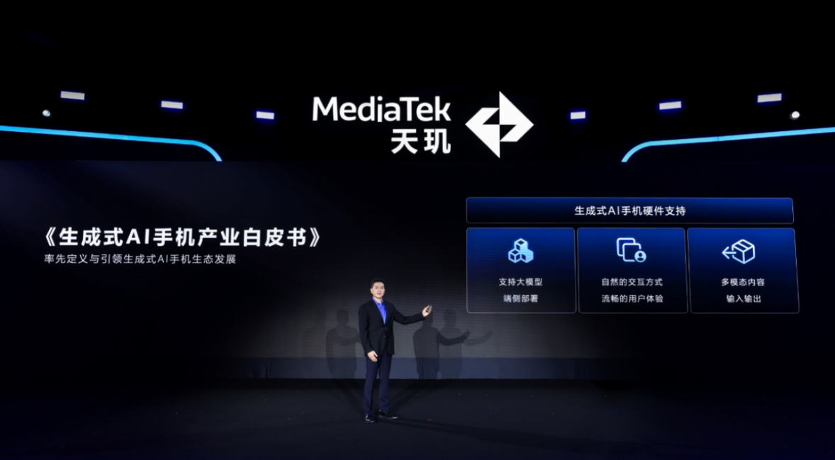 在天璣開發(fā)者大會上,聯(lián)發(fā)科聯(lián)合Counterpoint并攜手阿里云通義千問、百川大模型、虎牙、酷狗音樂、零一萬物、OPPO、Soul、騰訊AI Lab、騰訊混元、vivo行業(yè)頭部伙伴聯(lián)合發(fā)布《生成式AI手機(jī)產(chǎn)業(yè)白皮書》,共同定義了“生成式AI手機(jī)”的概念和典型特征?!栋灼诽岬剑荷墒紸I手機(jī)是利用大規(guī)模、預(yù)訓(xùn)練的生成式AI模型,實(shí)現(xiàn)多模態(tài)內(nèi)容生成、情境感知,并具備不斷增強(qiáng)的類人能力。生成式AI手機(jī)開啟了智能手機(jī)發(fā)展的新周期,長遠(yuǎn)看,智能手機(jī)將會發(fā)展為移動智能體。