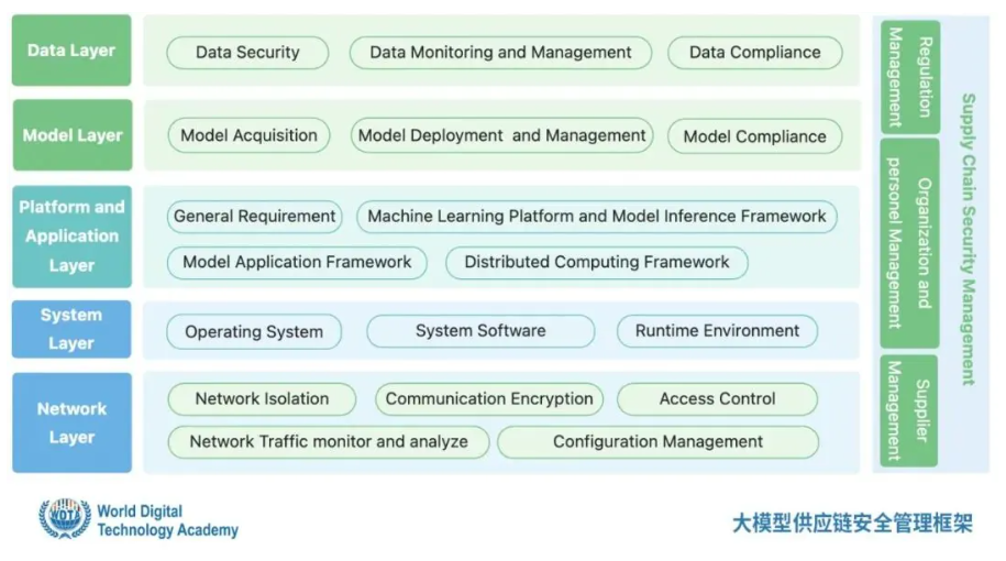 該標(biāo)準(zhǔn)不僅全面覆蓋了大型語(yǔ)言模型(LLM)的整個(gè)生命周期,包括其開發(fā)、訓(xùn)練、部署及維護(hù)等各個(gè)階段,更在每個(gè)環(huán)節(jié)都給出了詳盡的操作指南。標(biāo)準(zhǔn)的核心內(nèi)容強(qiáng)調(diào)了一種多層次的安全防護(hù)方法,從網(wǎng)絡(luò)層、系統(tǒng)層、平臺(tái)和應(yīng)用層,到模型層以及數(shù)據(jù)層,每個(gè)層級(jí)都有嚴(yán)密的安全措施,確保整個(gè)大模型系統(tǒng)的安全無虞。