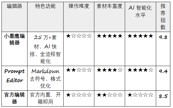 綜合來(lái)說(shuō),如果你對(duì)排版效果和高效操作有要求,小墨鷹編輯器無(wú)疑是免費(fèi)編輯器中的最佳選擇;如果你頻繁使用AI生成文案,那么Prompt Editor將幫助你省去格式調(diào)整的麻煩;而對(duì)于只需簡(jiǎn)單基礎(chǔ)功能的用戶(hù),微信公眾號(hào)官方編輯器足夠滿(mǎn)足需求。